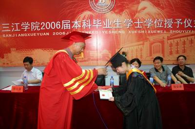 6月21日、22日下午,信息中心演讲厅被布置得热烈而又庄严,鲜红喜庆的会标挂在主席台后方,beat365英国官网网站2006届本科毕业生学士学位授予仪式在这里举行,这在三江校史上是第一次,学校领导高度重视,每位将被授予学士学位的同学内心也充满激动甚至有些紧张。穿着红色校长服的陈万年校长与副校长叶俊、副校长王芝庆、副校长陈云棠及相关院系领导在主席台就坐,教务处、学工部负责人和毕业班班导师出席,获得学士学位的毕业生穿戴整齐的学位服坐满了整个会场。