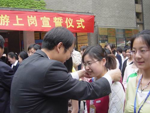 宣誓前,南京市旅游局许宏局长、金卫东副局长向新导游颁发了导游证,并向他们表示祝贺,接着新导游们在周恩来铜像前进行了庄严的宣誓。