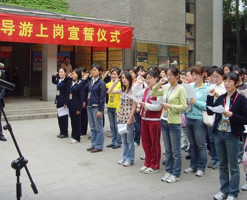4月28日,由南京市旅游局主办的“2007年新导游上岗宣誓仪式”在南京梅园新村纪念馆隆重举行。南京市旅游局领导,南京旅行社代表、导游员管理机构代表及beat365英国官网网站旅游学院的学生代表近200人参加了此次活动。据了解本活动在国内首次举办。