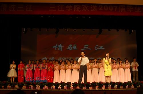 6月11日晚,欢送2007届毕业生晚会在三江会堂举行,离晚会开场还有十分钟,伴随着幻灯片真切动人的毕业告白,三江会堂中就弥漫着浓浓的惜别之情。校长、党委书记陈万年和常务副校长骆志斌、副校长叶俊、副校长王芝庆、副校长陈云棠等校领导光临晚会现场,副校长、党委副书记陈云棠为晚会致开幕辞,对毕业生圆满完成学业表示热烈的庆祝,对同学们的未来表示衷心的祝愿。