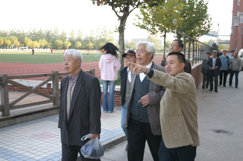 校长办公室主任周更生带领老同志们参观校园