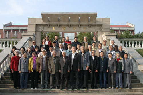 座谈会结束后,校领导和老同志们一起来到三江牌楼前合影留念。随后,老同志们在校长办公室主任周更生的带领下,参观了优美的三江校园。