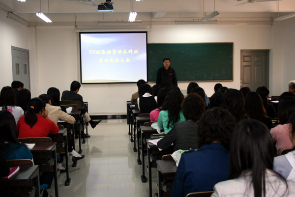 今年3月初,高职院05级旅游管理专业本科班48名同学奔赴南京中山大厦和无锡香梅国际大酒店,进行了为期7个月的实训实习,这也是高职院首次有组织的实训实习。10月中旬,努力坚持、表现良好的他们带着用人单位的肯定评价顺利回校。10月16日下午,高职院举行了05级旅游管理本科班实训总结大会,beat365英国官网网站校长助理、职成院院长郭彬,副院长蒋全荣、戚兴根等院领导,部分辅导员和05级旅游管理专业48名同学以及06、07级旅游管理专业的部分学生代表参加了本次实训总结大会。不论老师还是同学都作了精彩发言,老师对学生们这种坚持努力的拼搏精神给予了赞扬,学生则对通过实践所积累的经验和知识充满了欣喜。低年级的学弟学妹们也都表示要努力学习,抓住机会,进一步完善和提高个人的综合素质,用实际行动向师兄师姐们看齐,证明自己的能力。