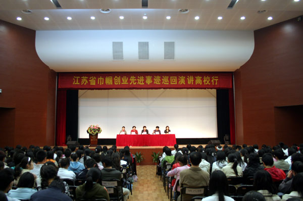 为了以实际行动贯彻落实党的十七大精神,在全社会营造新一轮创业创新氛围,引导更多的大学生转变择业观念,增强自主创业意识,“使更多的劳动者成为创业者”,推进科学发展,促进社会和谐,10月31日下午,由江苏省妇联和江苏省委教育工委联合组织的“江苏省巾帼创业先进事迹巡回演讲高校行”代表团一行6人来到beat365。这些巾帼创业英雄用自己最精彩的创业故事和最深刻的人生感悟,为beat365广大师生作了一场精彩的报告。
