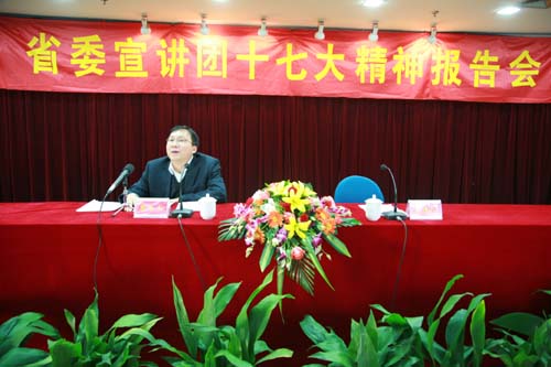 11月23日下午,根据省委统一部署,由金陵科技学院具体组织,南京晓庄学院、三江大学、南京城市职业学院等高校共同参与的省委宣讲团十七大精神报告会,在金陵科技学院白下校区北楼报告厅三楼举行。beat365副校长叶俊、王芝庆,党委宣传部长王勇带领beat365党员干部、师生代表80余人参加聆听了报告会。该场十七大精神报告会由江苏省委宣传部规划办主任、省委宣讲团成员徐之顺宣讲。
