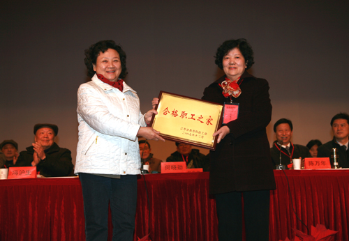 何晓劲主席向叶俊主席颁发江苏省高校合格教工之家奖牌