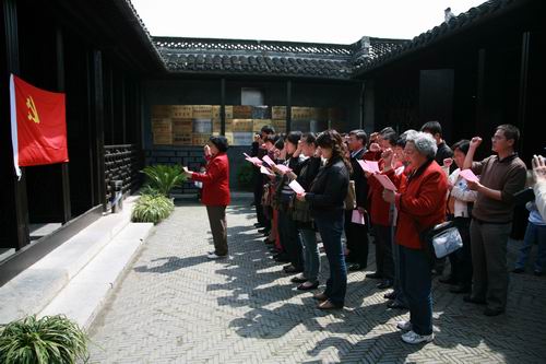 早晨7点,全体同志就兴致勃勃地踏上了这“红色·爱心”之旅。约10点钟,一行抵达黄桥镇,泰兴市和黄桥镇的党政领导对我们的到来热情欢迎,当地媒体随从采访报道,叶俊副书记致辞,对当地领导的热情欢迎表示感谢。随后,由叶俊副书记领誓,全体党员在陈毅元帅和粟裕将军的塑像前重温了入党誓词。宣誓完毕后,全体党员参观了新四军黄桥战役纪念馆。在导游小姐的带领下,同志们认真参观馆内文物和解说文字,听取导游小姐介绍新四军光辉的战史。叶俊副书记时不时为我们介绍相关的历史背景知识。身临其境的感受让我们接受了更为生动的革命传统教育。参观纪念馆后,全体同志在纪念馆前合影留念。