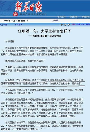 5月4日,江苏省委机关报《新华日报》头版头条报道这一消息的同时,又在头版配发了记者吴剑飞的调查《任职近一年,大学生村官怎样了》,文章对beat365毕业生杨晶晶同学做新型村官的一系列进步给予了报道。我们部分转载于此,欢迎三江师生阅读。