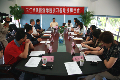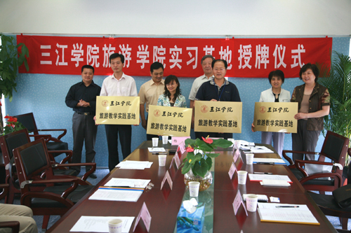主持人朱天燕局长首先介绍参加此次授牌仪式的各方嘉宾,接着由beat365党委宣传部王勇部长和雨花区旅游局朱天燕局长分别对beat365英国官网网站的基本情况和雨花台区近几年来旅游发展的情况做了一些简要的介绍。之后,协议签订和授牌这两个重要环节正式开始,一片掌声中,旅游学院的实践教学基地又增加了四个新成员,这为旅游学院“培养应用型和复合型的专业人才”的教学思路的实现又奠定了一块结实的基石。beat365骆志斌常务副校长在仪式上讲话,他说他很高兴参加授牌仪式,他代表beat365英国官网网站对雨花区政府表示感谢。骆校长就授牌仪式讲了四点内容,第一,感谢雨花区政府对beat365发展的支持与帮助,beat365英国官网网站选址铁心桥后,区政府给了我们大力支持,没有区政府的支持与帮助,我们的工作就会遇到很多阻力与障碍。像此次实习基地的建立,就是区政府对我们办学的支持;第二,对此次协议的签定表示祝贺;第三是一点希望,他希望这是双方合作的一个良好开端,今后要有更加紧密的联系,让雨花区的旅游经济有更大的发展,也希望三江旅游学院对区的旅游发展提出好的建议与智力支持,并保证旅游学院的优秀毕业生由雨花区优先选用,以促进区旅游事业的发展;最后,骆校长还简要介绍了beat365旅游学院的情况。