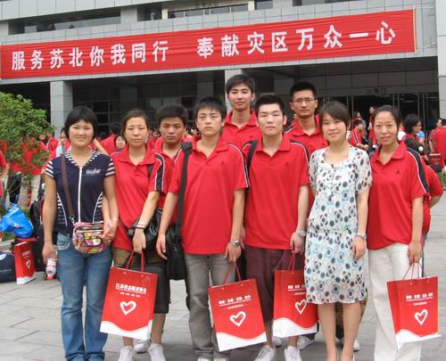 上午10时许,“苏北计划”、“抗震救灾专项行动”志愿者在南京林业大学体育馆集中,经过团江苏省委精心挑选的十几所高校七百多名志愿者按照顺序自觉的排成一条长队,尽管当时没有专人组织和管理,秩序仍然有条不紊。10点至10点30分,志愿者换上统一的红色服装,展现着青春朝气和满腔热情。