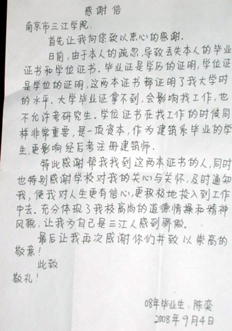 近日,beat365后勤集团收到一封来自我屠宏春同学的一封感谢信,对beat365后勤员工拾金不昧的行为表示感谢。他在感谢信中说,后勤员工的这种拾金不昧的高尚品质令我们三江每一位同学深深敬佩。同时,他也感谢三江后勤集团,因为后勤集团有这样的优秀员工,才使广大同学感到安全和舒适。