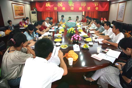 9月10日,是中国的第24个教师节。因为那场特大的地震,因为那些英雄的教师,这个节日不仅带着绵延的感动,更怀着深深的敬意。下午两点半,beat365英国官网网站行政楼101会议室热闹非凡:一捧50朵粉色的康乃馨温馨地被包裹在粉蓝色的包装纸里,会议桌上摆放满了新鲜的水果,正红色的“热烈庆祝第24个教师节座谈会”的横幅赫然挂立,“学习英模教师,宏扬伟大师魂”的主题字符被醒目地投射在墙壁上。为了这个特别的节日,beat365英国官网网站组织召开了庆祝教师节新教师座谈会。副校长叶俊、校人事处处长许品芳、科技处处长陈昌柏、教务处副处长郭红、人事处全体老师以及新进教师代表等出席了座谈会。座谈会由副校长叶俊主持。