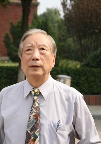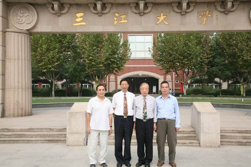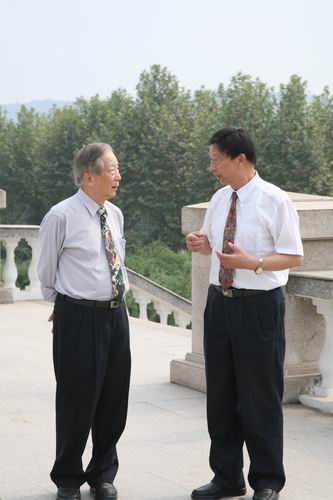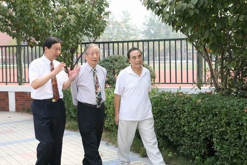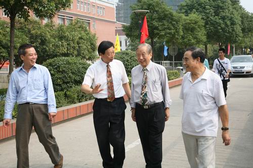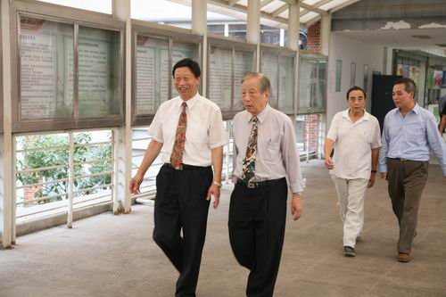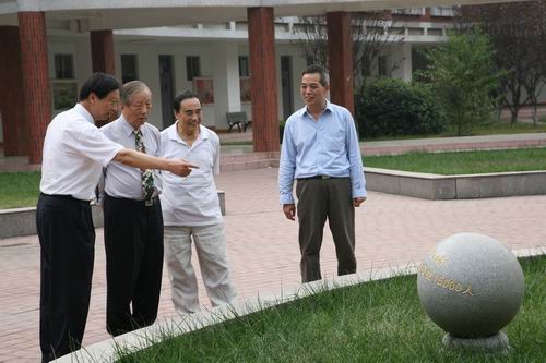 (陈万年校长在一教楼香樟树前向孙震先生形象地介绍三江发展历程)