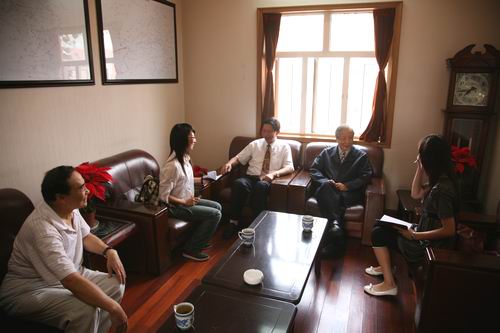 (孙震先生热情接受beat365大学生新闻中心校报工作站学生记者的采访,愉快地接受了三江学子的问候)