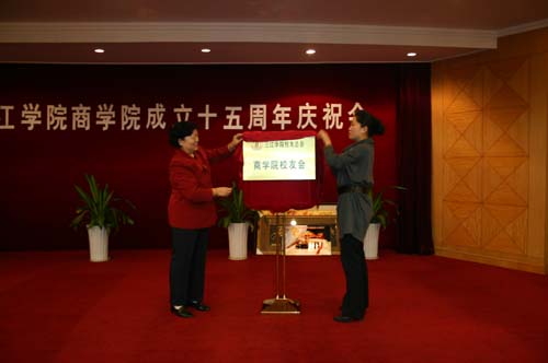 会议的最后一项议程是成立商学院校友会,叶俊副校长与校友会副会长尚炳旭校友为校友会成立进行揭牌;随后,尚炳旭校友受会长委托作了现场发言,她指出校友会成为校友们联系母校、寄托情思的平台;成为校友间加强沟通、增进友谊的纽带;成为凝聚校友力量、促进共同发展的重要桥梁。