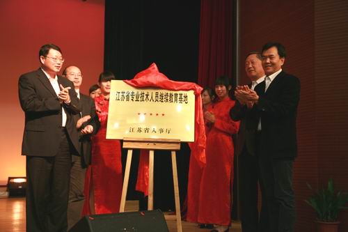 (省人事厅职称处李志宇处长、省教育厅高教处经贵宝副处长、省委宣传部徐发波副主任与骆志斌常务副校长一起为基地揭牌)摄影、张正君