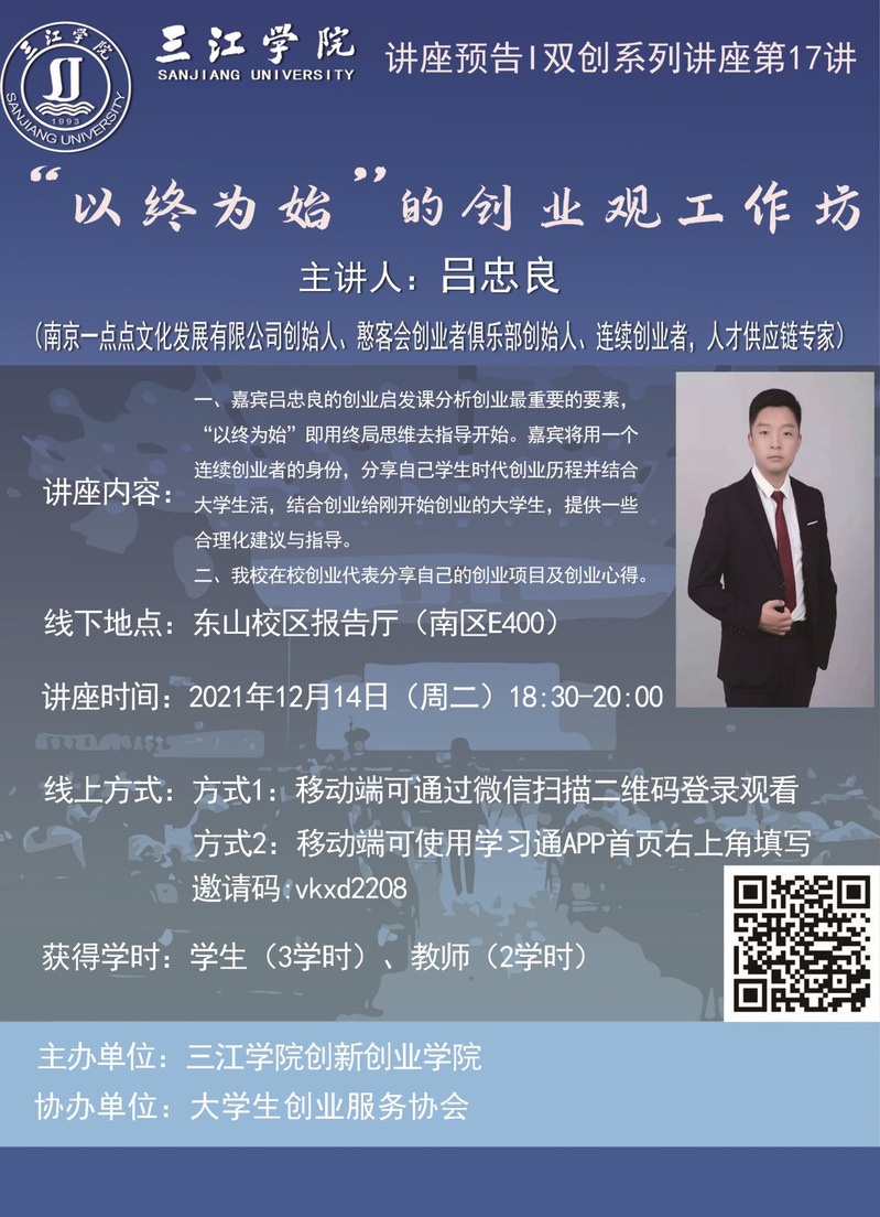 讲座预告丨beat365英国官网网站双创系列讲座第17讲—— “以终为始”的创业观工作坊