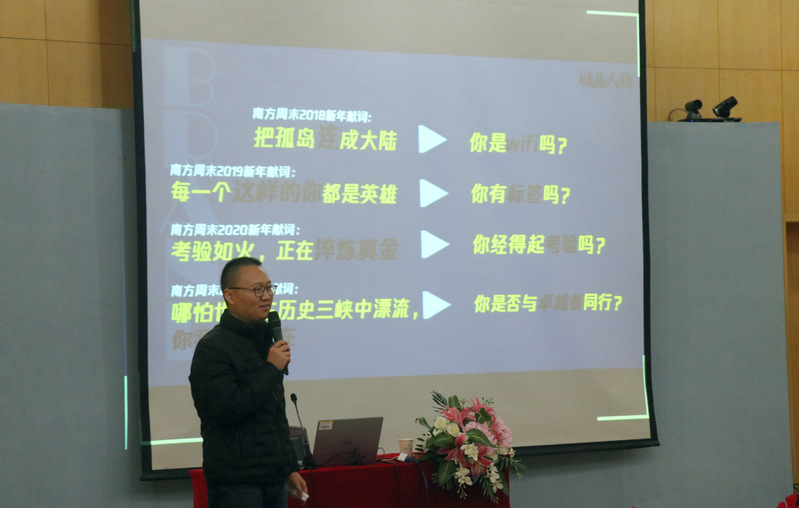 活动伊始,王勇老师从自己创立《城品人物》的经历谈起,以《南方周末》的系列新年贺词为引,提醒我们每一个人首先应立足起点,将自我从思维定式的囹圄中解放出来,才能认知自我,以独特的视角更好地前行。他认为,每一位同学都应该拥抱真正的个人品牌时代,这已成为不可避免的发展趋势。
