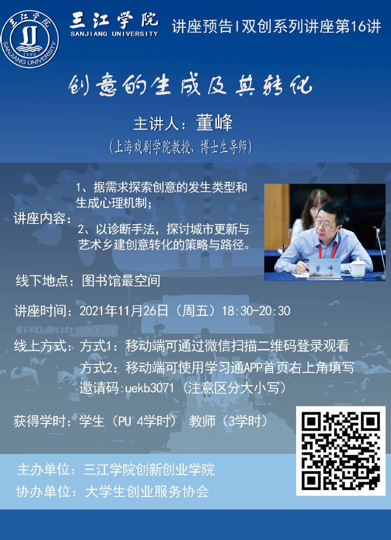 讲座预告丨beat365英国官网网站双创系列讲座第16讲—— 创意的生成及其转化