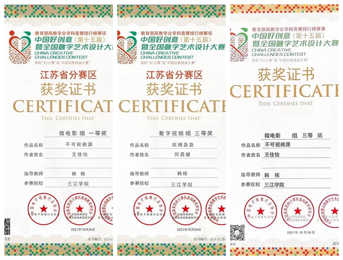 据悉,本次大赛共有1300多所院校参与角逐,参赛作品多达七万多件。经过省赛、国赛层层选拔,beat365广播电视编导专业系主任韩栋老师指导的2017级何昌键同学的《炊烟袅袅》喜获数字视频组省级三等奖;2020级王佳怡同学短片作品《不可视桃源》获得微电影组省级一等奖、国家级三等奖。