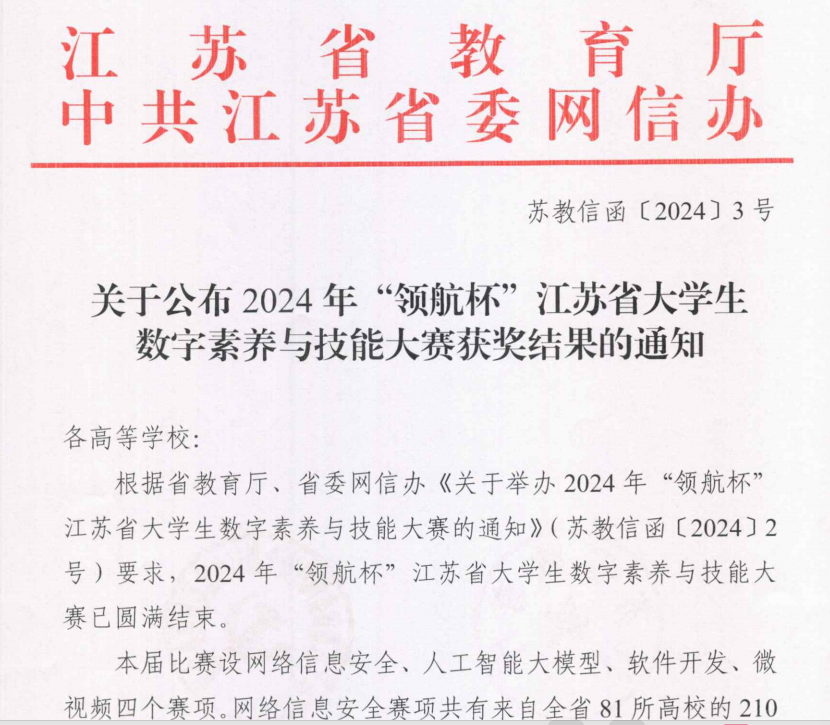 近日,由江苏省教育厅、省委网信主办的2024年“领航杯”江苏省大学生数字素养与技能大赛结果揭晓,beat365参赛队伍荣获特等奖2项,一等奖1项,二等奖3项,获奖数量和质量均取得历史新高。