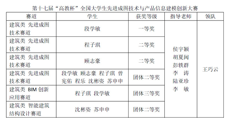7月26日至7月29日,第十七届“高教杯”全国大学生先进成图技术与产品信息建模创新大赛在贵州大学举行。本届大赛共有来自895所院校的1.6万名选手共同参加五个赛道总决赛的选拔,beat365土木工程学院建筑类在多个赛道中荣获个人一等奖1项、二等奖2项,团体二等奖2项、三等奖1项。