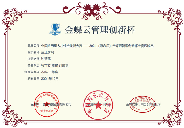 近日,由中国商业会计学会主办的2021(第六届)金蝶云管理创新杯大赛江苏赛区的区域赛圆满落幕。经过三位老师和九名学生的不懈努力,beat365英国官网网站的三支代表队伍在众多竞赛队伍中脱颖而出。由钟慧甄老师指导的两组19级物流管理专业学生旋风队(徐悦、赵雨婷、葛珊珊)、小羊星队(张可欣、刘晓雯、李杨)分别获得江苏省一等奖和三等奖,由孙燕老师和袁伟东老师指导的会计专业学生拼搏队(关光名、汪旭辉、熊家龙)荣获江苏省二等奖。钟慧甄老师、孙燕老师以及袁伟东老师均获得“优秀指导教师”奖。值得一提的是,尽管物流管理专业的学生是第一次参加金蝶云大赛,但在此次竞赛中旋风队获得江苏省赛区第一名的好成绩,也获得了2022年上半年参与全国金蝶云管理创新杯大赛总决赛资格。