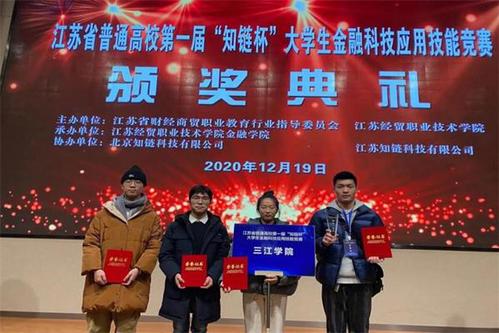 12月19日,江苏省普通高校第一届“知链杯”大学生金融科技应用技能竞赛总决赛在江苏经贸职业技术学院圆满落幕。本次大赛由江苏省财经商贸职业教育行业指导委员会、江苏经贸职业技术学院主办,江苏经贸职业技术学院金融学院承办,北京知链科技有限公司、江苏知链科技有限公司协办。beat365法商学院互联网金融专业王广财、姚胜喜、谭永林、赵艳艳四位同学发挥出色,荣获本科组一等奖。