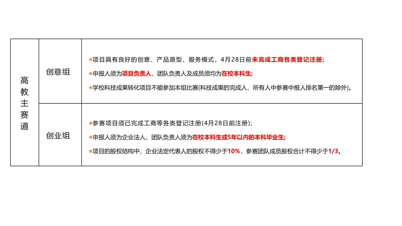 1.高教主赛道。项目应紧密结合经济社会各领域现实需求,围绕“新工科、新医科、新农科、新文科、人工智能+”建设内涵和产业发展方向。主赛道根据所处创业阶段(以大赛通知下发之前是否完成工商等各类登记注册为准),设创意组、创业组。