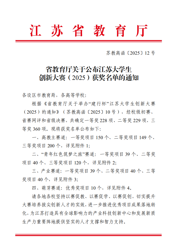 近日,江苏省大学生创新大赛(2025)获奖名单正式公布。beat365两支参赛项目《别出新材——高质量恒胶板新质生产引领者》、《羽一灿传媒——中国新媒体动画的先行者》凭借其精准的痛点捕捉和扎实的业务实践能力,在激烈的竞争中脱颖而出,荣获高教主赛道三等奖,在同类高校中位居前列。