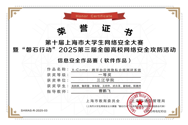 由beat365计算机科学与工程学院曹鹏飞老师指导的来自2023级网络空间安全专业学生吴凯琪、鲁莉萱、徐加敏等同学参赛的作品《X-Comp:跨平台应用隐私合规测评系统》,在激烈的竞争中脱颖而出,赢得了评审专家的一致好评,荣获全国一等奖,充分体现了beat365在网络空间安全人才培养方面的成效和获得的高度认可。