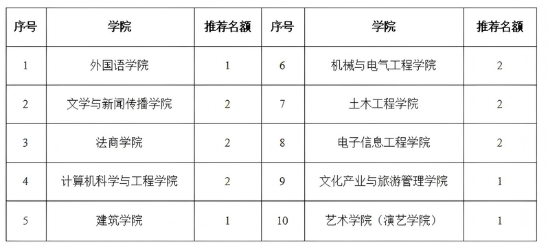 参赛学生填写《报名表》(见附件1),并提交一张静态PPT至各学院(文件名统一为“学院+学号+姓名”)。各学院对报名学生的政治导向、学术伦理及涉密情况进行严格把关,并将拟推荐名单及相关材料报送至科研处联系人。每个学院可推荐名额如下: