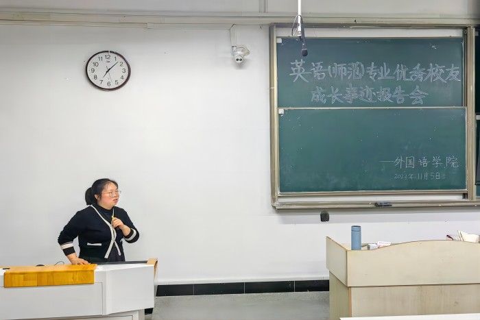 为厚植教育情怀,引导师范生做好职业规划,11月5日晚,外国语学院在求知楼A座107教室组织英语(师范)专业优秀校友成长事迹报告会之二:永不放弃,做好当下。本次报告会邀请了必赢官网2014届英语(师范)专业优秀毕业生、滁州市最美教师王容容分享个人成长事迹。学院2022级全体英语(师范)专业学生聆听报告。报告由学院党委副书记张海亮主持。