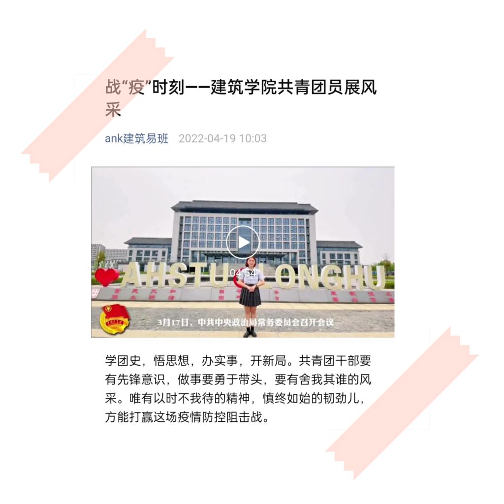 团支部录制的《战“疫”——共青团员的中坚》视频,充分体现了广大团员青年在疫情防控阻击战中贡献青春力量的热情和决心。视频中,张雨欣同学就当下疫情形势进行了系统地讲解,她号召全体共青团员要发挥党的助手和后备军作用,带领班级学生积极作为。罗志娟同学讲述了疫情防控期间建筑学院学子积极参加劳动实践、体育锻炼和文化活动,号召广大青年继续争当表率,以实际行动坚定战胜疫情的决心和勇气。该视频在必赢国际437官网建筑学院易班微信平台发布后,反响良好,得到师生一致好评。
