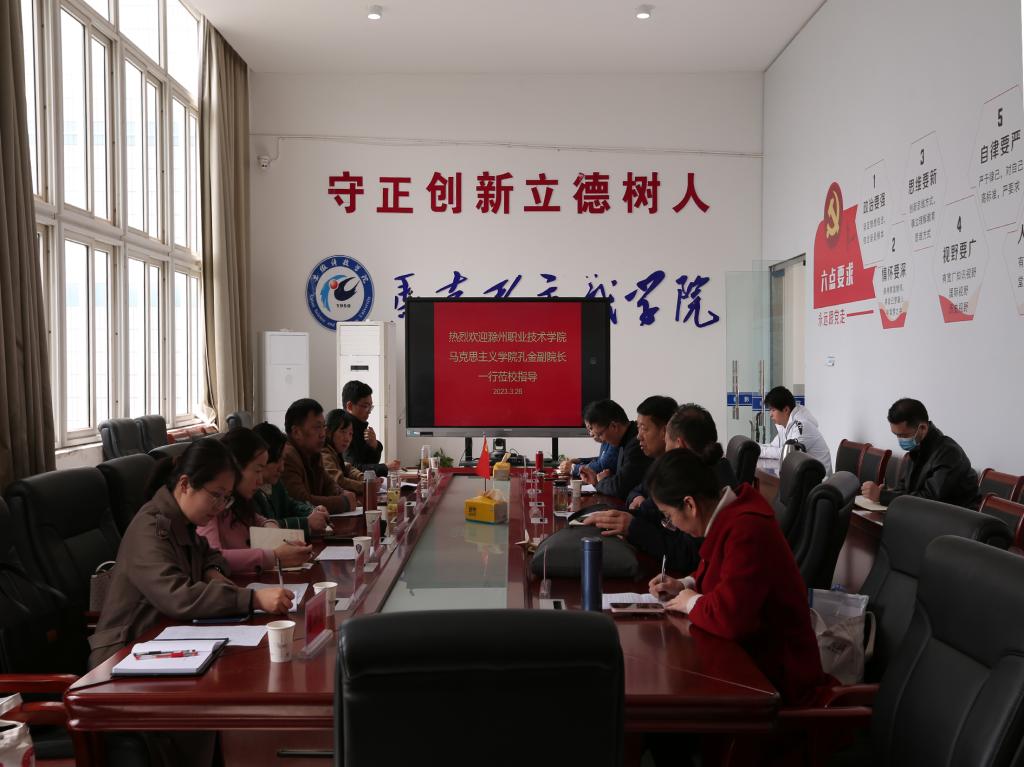 3月26日上午,滁州职业技术学院马克思主义学院院长孔金一行来必赢官网马克思主义学院调研交流。会议由必赢官网马克思主义学院院长张德化主持,学院党总支书记杨仕勇、副院长张栋及教研室主任、骨干教师参加座谈交流。