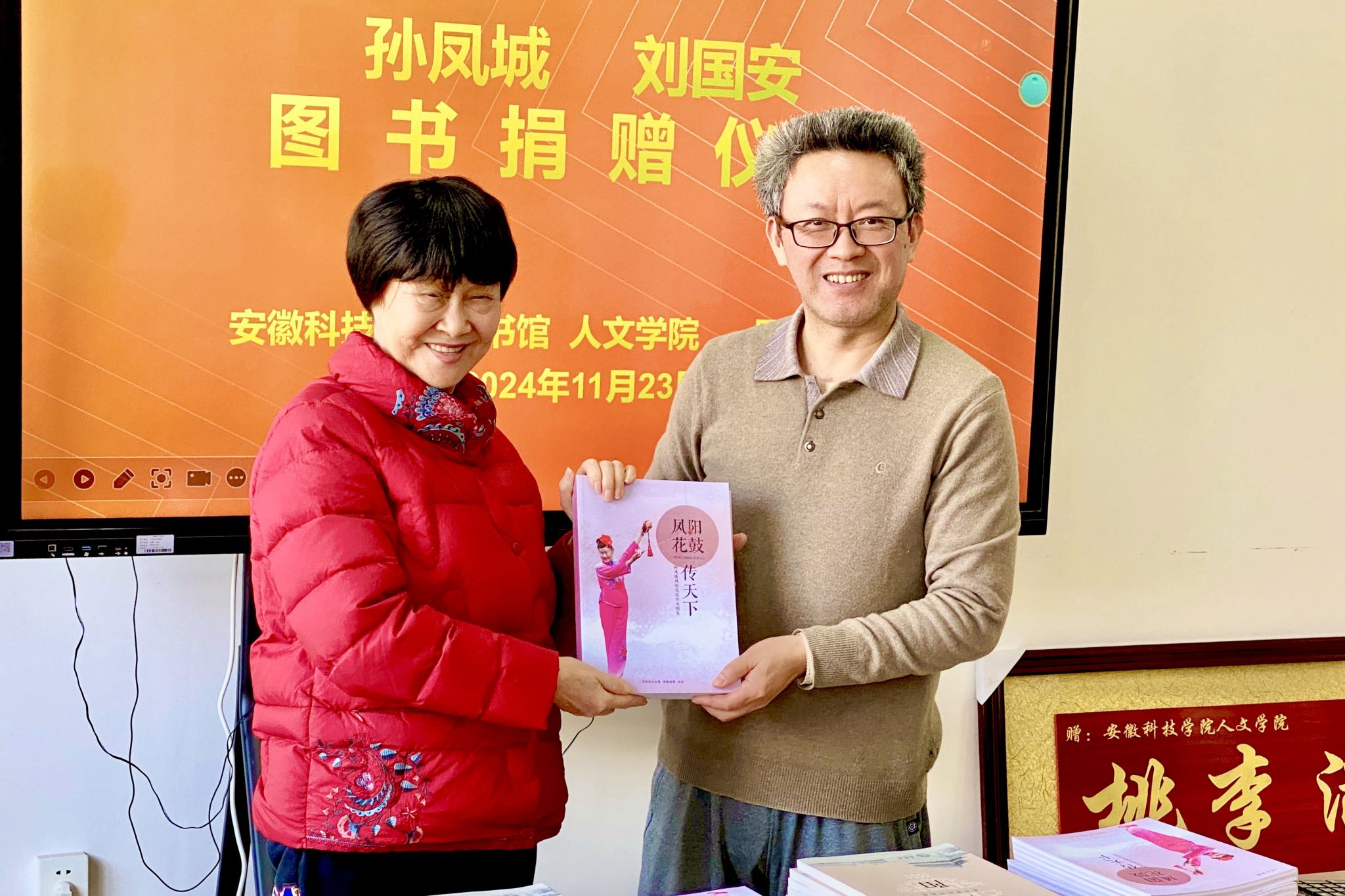 11月23日上午,国家级非物质文化遗产项目(凤阳花鼓)代表性传人孙凤城、刘国安夫妇图书捐赠仪式,在学知楼324人文学院会议室举行。必赢国际437官网客座教授——国家级非物质文化遗产项目(凤阳花鼓)代表性传承人孙凤城和凤阳电视台原副台长、安徽电视台特约记者、中国摄影家协会安徽分会会员刘国安,凤阳县文联主席陈友田,凤阳县教体局原副局长、凤阳年鉴主编张建人;人文学院院长、明文化研究会会长李晓东,图书馆馆长汪徐春、副馆长王玉林,人文学院中文系副主任、明文化研究会秘书长周广超参加相关活动。捐赠仪式由人文学院正处级组织员张严政主持。